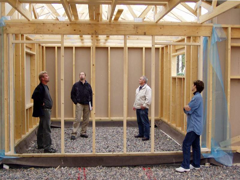 Vandaag is dan eindelijk de gemeente komen kijken. Van links naar rechts; Bob de bouwer, Jari de opzichter, de afgever van de bouwvergunning voor de gemeente en Tarja.
