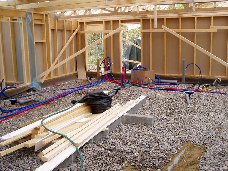 In het midden van de foto is waar het water het huis binnenkomt. Als je goed kijkt kun je aan de linkerkant zien dat ze te weinig rode buis bij zich hadden, want daar komen twee blauwe leidingen naar boven op een plek waar een wastafel komt.